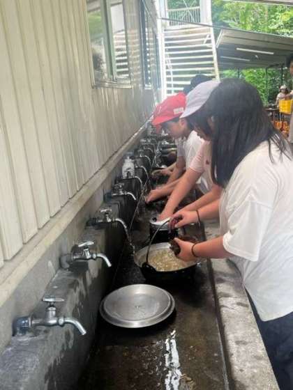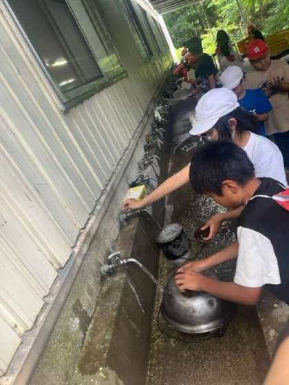 食べ終わったあとは、鍋や飯ごうなどピカピカになるまで洗います。