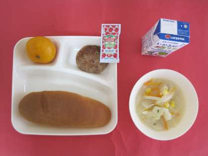 じゃがいも、たまねぎ、キャベツ、コーン、にんじん、パセリを使った豆乳スープと冷凍みかんです。