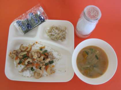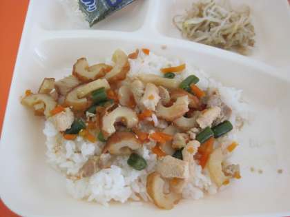 具をごはんの上にかけて、自分たちで混ぜて食べるかやくご飯です。