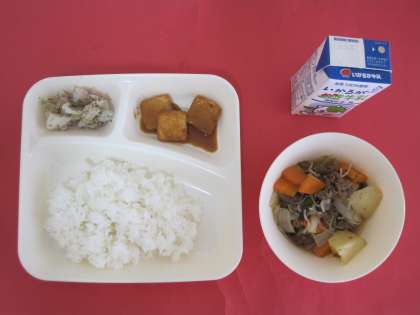 牛肉、じゃがいも、糸こんにゃく、たまねぎ、にんじん、さんどまめを使った肉じゃがです。
