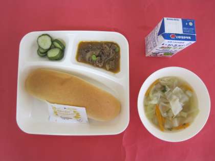 ウインナー、じゃがいも、キャベツ、にんじん、パセリを使ったスープときゅうりのピクルスです。