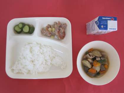 鶏肉、こんにゃく、さといも、たまねぎ、にんじん、れんこん、さんどまめ、しめじを使ったふきよせ煮ときゅうりの甘酢づけです。