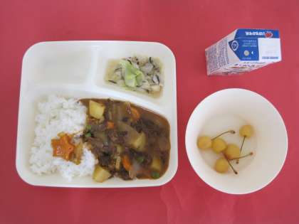 ゆでたキャベツをひじきを使ったドレッシングで和えた和え物と缶詰のさくらんぼです。
