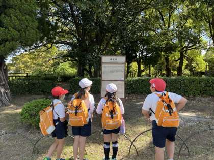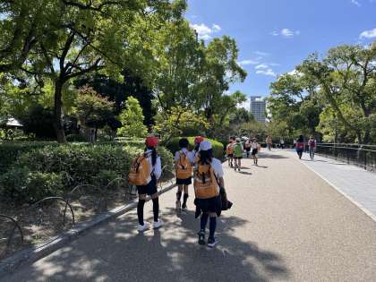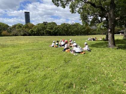 秋の遠足で大阪城公園に行きました。さわやかな秋晴れの下、すごく楽しいひと時を過ごしました。グループでオリエンテーションをしました。友達と一緒に地図を見て、コースを回り、ポイントでクイズを解きました。その後、西の丸庭園に行き、お昼ご飯を食べ、鬼ごっこをしていました。大阪城を見上げて、秋の自然を満喫していました。