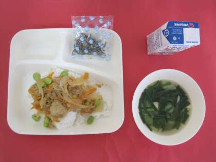 豚肉、たまねぎ、むきえだまめ、にんじん、にんにく、しょうがを使ったピリ辛丼です。