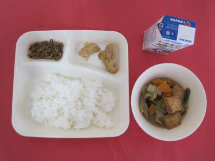 あつあげ、はくさい、にんじん、ごぼう、さんどまめ、しいたけを使った和風の煮ものとかつおぶし、だいこん葉、いりごまを炒め、みりん、濃口しょうゆで味つけした、おかかなっ葉です。