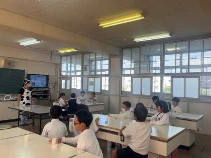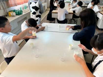 10月17日(火)日本乳業協会の方々による、ミルク教室がありました。「牛乳がそのまま飲めるのはなぜ?」をテーマに、牛乳が牛から搾取され手元に届くまでの工程やカルシウムについて学習しました。その後、牛乳にフルーツジュースを混ぜ、フルーツオレを作りました。においや味など風味を感じながらおいしくいただきました。