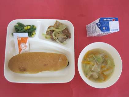 鶏肉、じゃがいも、キャベツ、にんじん、パセリを使ったスープとさんどまめとコーンのサラダです。
