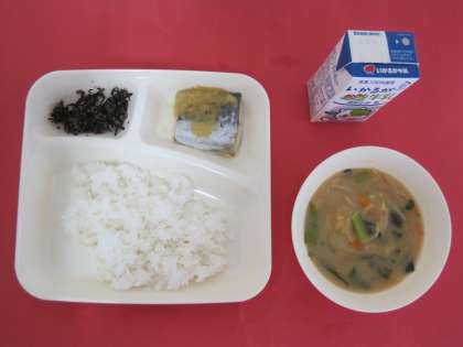 うすあげ、はくさい、たまねぎ、こまつな、にんじん、えのきたけを使ったみそ汁と牛ひき肉、しそ、ひじきを炒め、砂糖、みりん、薄口しょうゆで味つけした牛ひじきそぼろです。