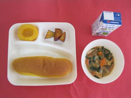 さつまいもを揚げて、砂糖、塩、濃口しょうゆで作ったみつをかけた大学いもと缶詰の黄桃です。