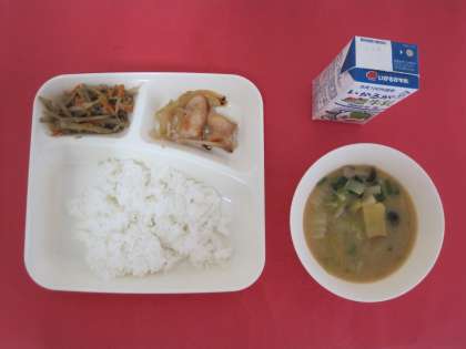 さつまいも、はくさい、青ねぎ、しめじを使ったみそ汁と豚ひき肉、ごぼう、にんじんをごま油で炒め、砂糖、みりん、濃口しょうゆ、ラー油、いりごまで味つけしたきんぴらです。