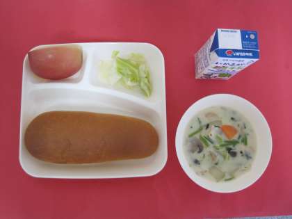 しめじ、エリンギ、マッシュルームの他に鶏肉、じゃがいも、たまねぎ、にんじん、ほうれんそうを使ったクリームシチューです。小麦粉と綿実油でホワイトルウを作ってとろみをつけています。