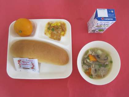 缶詰のツナ、コーン、ピーマン、細切りのチーズ、ピザソースを混ぜ合わせ、ぎょうざの皮にのせて焼いた変わりピザと季節のみかんです。