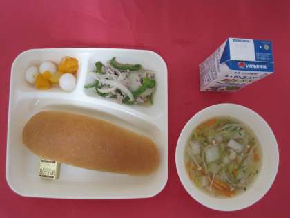 鶏肉、はくさい、にんじん、コーン、パセリ、えのきたけを使ったスープと白玉だんごとミックスフルーツを使ったフルーツ白玉です。