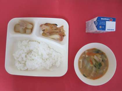 うすあげ、はくさい、にんじん、青ねぎ、しめじを使ったみそ汁とだいこんと豚肉を使った煮ものです。