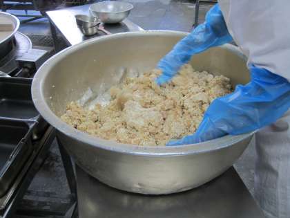 とうふローフをどのように作ったか給食室での様子を紹介します。