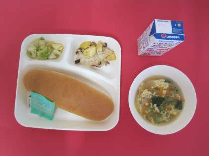 卵スープは、鶏卵にアレルギーのある児童は、卵を入れる前に取り分けたものを食べました。