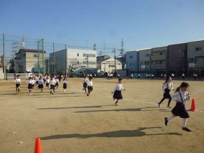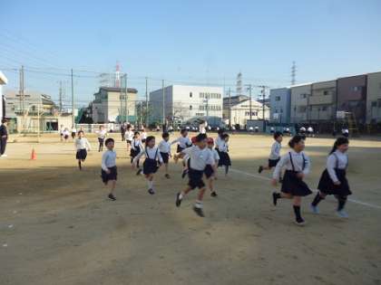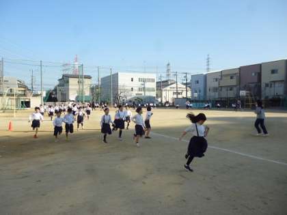 各学期に運動週間を設けています。3学期は「かけ足集会」です。火曜日は、低学年(1〜3年生)で実施しました。