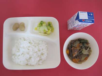 牛肉、じゃがいも、糸こんにゃく、たまねぎ、にんじん、さんどまめを使った肉じゃがです。