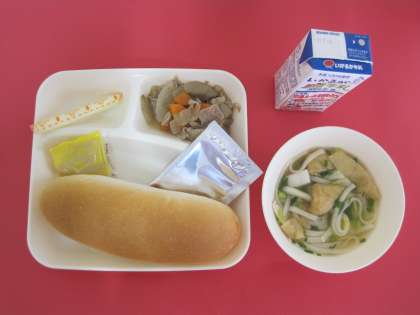 大阪市の給食では、大阪が発祥のきつねうどんをイメージしたうどんが登場します。それが、かまぼこ、うすあげ、うどんを使ったなにわうどんです。それと棒チーズです。