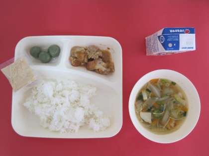 かまぼこ、たまねぎ、はくさい、にんじん、青ねぎ、えのきたけを使った五目汁とよもぎだんごをゆで、砂糖、薄口しょうゆ、湯を合わせて煮、水どきでんぷんでとろみをつけたみつをからめ、きな粉をかけて食べるきな粉よもぎだんごです。