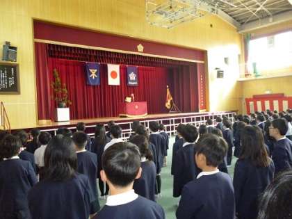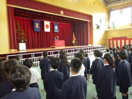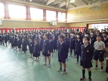 6年生が卒業したので、心なしかさみしく感じる講堂でしたが、児童は元気よく発表したり、校歌を斉唱したりしていました。