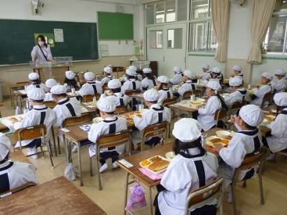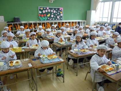 1年生は初めての給食。みんなそろって元気に「いただきます」。