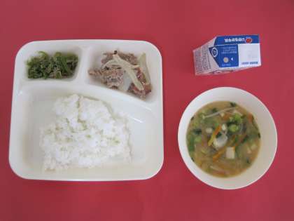 とうふ、キャベツ、にんじん、青ねぎ、えのきたけを使ったみそ汁とちりめんじゃことピーマンを炒め、砂糖、料理酒、濃口しょうゆで味つけしたじゃこピーマンです。