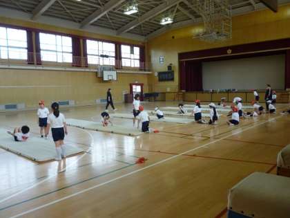 マット運動、前転の学習。 友だちの動きを参考に、練習に励んでいました。