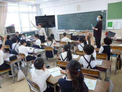 外国語活動の時間です。 ネイティブスピーカーの先生と一緒に楽しく活動しています。