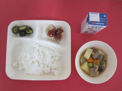 豚肉、じゃがいも、つなこんにゃく、たまねぎ、にんじん、むきえだまめ、しいたけを使った煮ものときゅうりを使った和え物です。