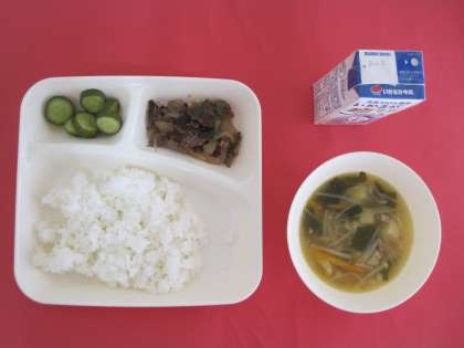 焼き豚、とうふ、にんじん、もやし、えのきたけ、わかめを使ったスープときゅうりの甘酢づけです。