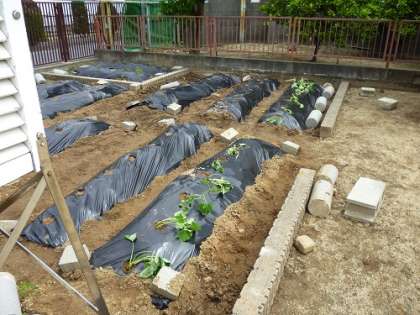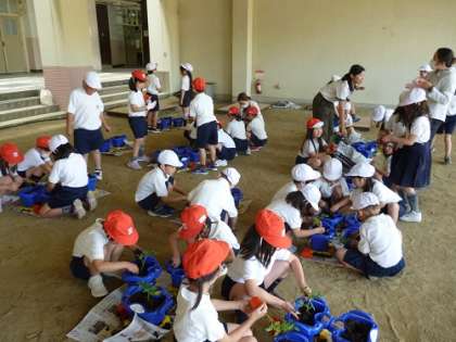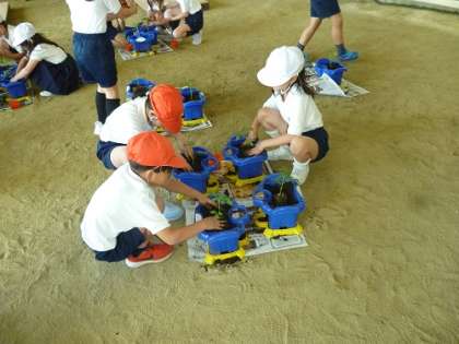 プチトマト、さつまいもを植えました。大きく育つようにと、ていねいに植え、水をあげていました。