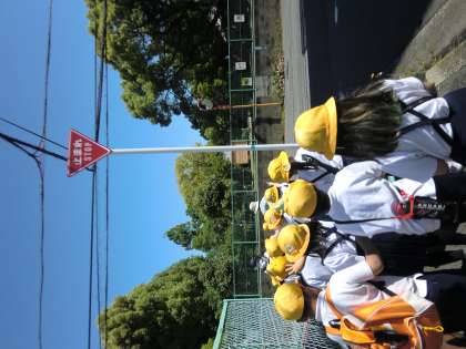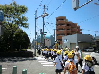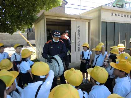 生活科「どきどき わくわく まちたんけん」の学習で、校区の中にはどんなお店や施設があるのかを見に行きました。子どもたちは、カーブミラーがいろいろなところにあることに気づきました。たまたま、消防署の方がポンプの点検に来ていたので、消火のためにホースやポンプを見せていただけました。