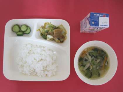 鶏肉、たまねぎ、チンゲンサイ、にんじん、えのきたけを使った中華スープときゅうりの和え物です。