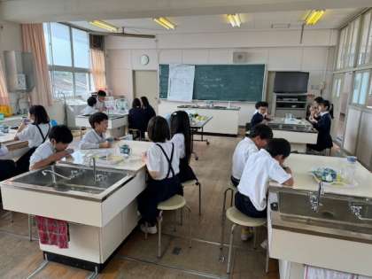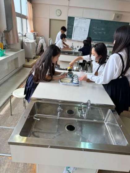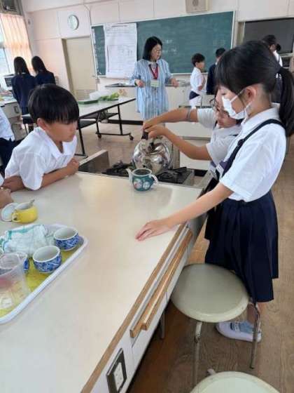 家庭科室にわくわくの子どもたち。家庭科室の使い方を学び、調理で使用する道具や器具の名前を覚え、お湯を沸かし煎茶を入れて飲みました。