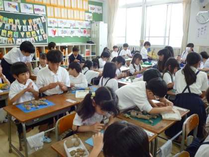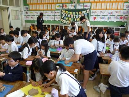 1年生は初めてのねんどあそびです。一緒にねんどで弁当づくりをしました。1年生と6年生が絵顔で交流するなか、こねたり伸ばしたり丸めたり、楽しくお弁当を作ることが出来ました。