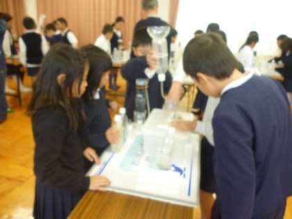 子どもたちは、にごった水がどんどんきれいになっていく様子に驚きながら観察していました。