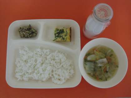 さといも、だいこんなどの入ったすまし汁とツナとだいこん葉を