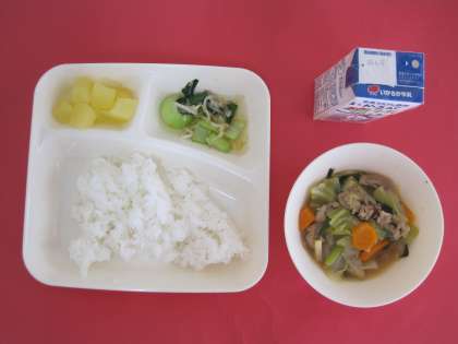 もやし、チンゲンサイをゆで、しょうが汁、砂糖、薄口しょうゆで作ったたれで和えた和え物と缶詰のりんごです。