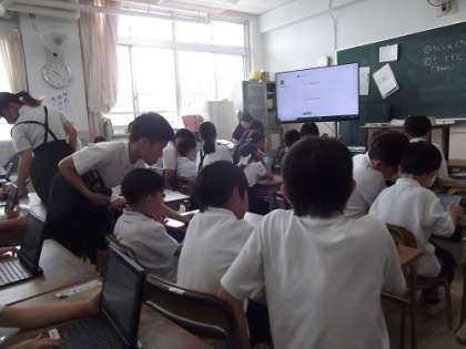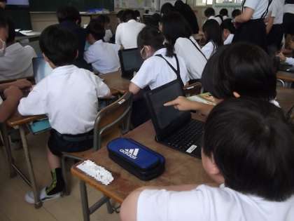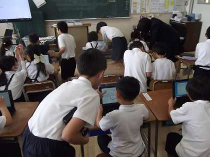 2時間目は、6年生が1年生にタブレット端末の使い方を教えました。1年生も少しずつタブレットの操作が上手くなってきています。6年生が教室中を飛び回り、優しく教えていました。1年生は大喜びでした。