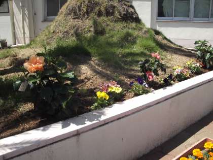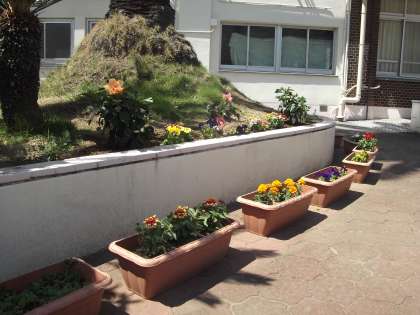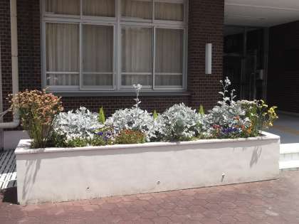 正門の花だんに季節の花が咲いています。