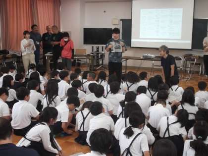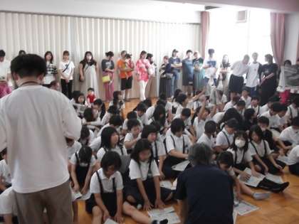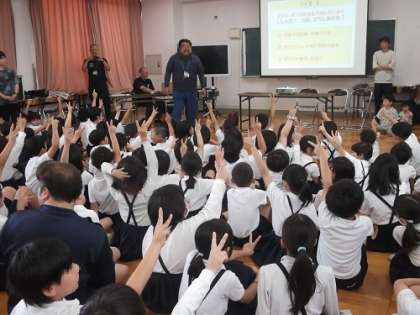 中学年は、新聞スリッパの作り方を学びました。身近なものが、もしかの時に役立てることが出来ることに子ども達も驚いていました。その後、区役所の方から防災クイズをしていただきました。クイズを通して防災に関する知識が深まったようです。