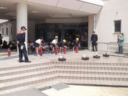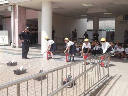 高学年は、起震車で震災体験をしました。想像以上の激しいゆれに驚き、地震の恐ろしさをより実感出来たようです。水消火器を使い消火体験も行いました。万が一に備え、対応できる力を少してでも身につけることが出来ればと思います。
