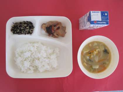 うすあげ、キャベツ、たまねぎ、こまつな、にんじん、を使ったみそ汁と魚ミンチ、しそ、ひじきを炒め、砂糖、みりん、薄口しょうゆで味つけした魚ひじきそぼろです。