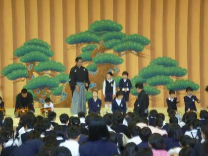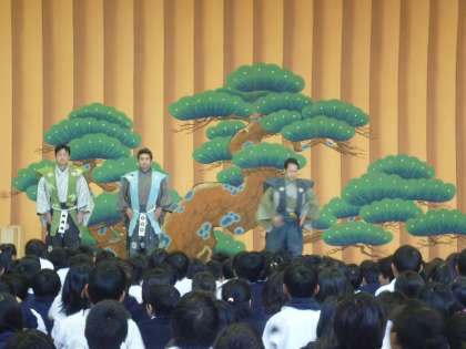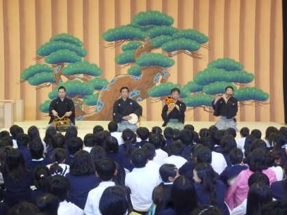 3・4時間目に狂言鑑賞がありました。伝統の楽器や独特の声の出し方など、とても迫力がありました。テレビでしか聞いたことないような「室町言葉」は難しかったかもしれません。