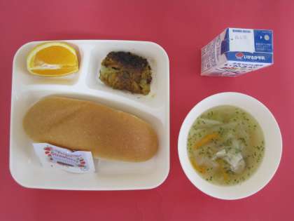 豚肉、キャベツ、にんじん、パセリを使ったスープとオレンジです。
