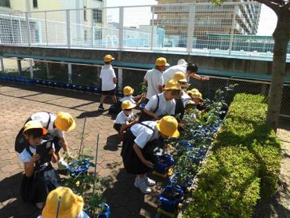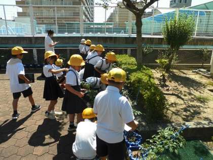 生活科の学習で育てているミニトマトの観察をしました。毎日水やりを頑張ってきたので、実が色づき始めています。収穫が楽しみです。