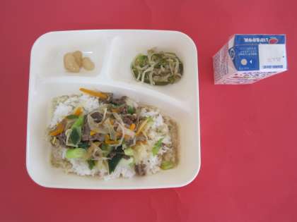牛肉、糸こんにゃく、たまねぎ、にんじん、青ねぎ、えのきたけを使った牛丼です。