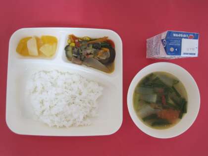 鶏肉、とうがん、トマト、にらを使ったスープとみかんゼリーと缶詰のミックスフルーツを混ぜ合わせたトロピカルゼリーです。